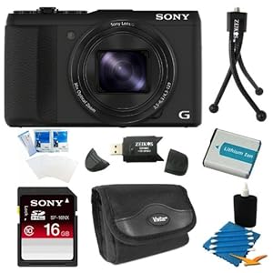 Bundle includes: Cyber-shot DSC-HX50V 20.4 MP 30x Optical Zoom WiFi Digital Camera 16 GB Secure Digital High Capacity (SDHC) Memory Card - Class 10 NP-BX1 1600MAH Battery Pack for the Select Sony Cameras and Camcorders Compact Digital Camera Deluxe Carrying Case - BTC4 Hi-Speed SD USB 2.0 Card Reader Flexible Mini Table-top Tripod Digital Camera and Camcorder Screen Protectors for LCD's (pack of 3) 3pc. Lens Cleaning Kit 30x optical zoom plus 60x Clear Image Digital ZoomGet super close with 30x optical zoom plus 60x Clear Image digital zoom. Most digital zooms use electronic cropping to get closer to the subject, resulting in unsharp images. With Clear Image Zoom the powerful processor compares patterns found in adjacent pixels and creates new pixels to match selected patterns, resulting in more realistic, higher-quality images. Clear Image Zoom doubles optical zoom for closer photos. Optical SteadyShot image stabilizationOptical SteadyShot image stabilization reduces shake and blur by countering camera movements in both horizontal and vertical directions. Active 3-Way stabilization adds digital rolling control that counters clockwise and anti-clockwise rotation, resulting in more stable videos even at long focal lengths 20.4 Megapixel Back-illuminated Exmor R CMOS Image SensorThis camera features a 20.4 megapixel Exmor R CMOS image sensor that brings out the full resolving power of the camera's Carl Zeiss Vario-Sonnar T lens to deliver extremely fast speed, high resolution, and stunning low-light sensitivity with improved image clarity and drastically reduced grain. Full HD 1080/60pRecord crystal clear movies at the highest resolution available with capabilities for 60p in 1080 AVCHD video. This provides stunning, fast motion video with less distortion for playback on your HD TV. With dual record of stills and movies, you can shoot both at the same time. Full manual & dedicated EV control dial allow more creativityFor creative flexibilit...